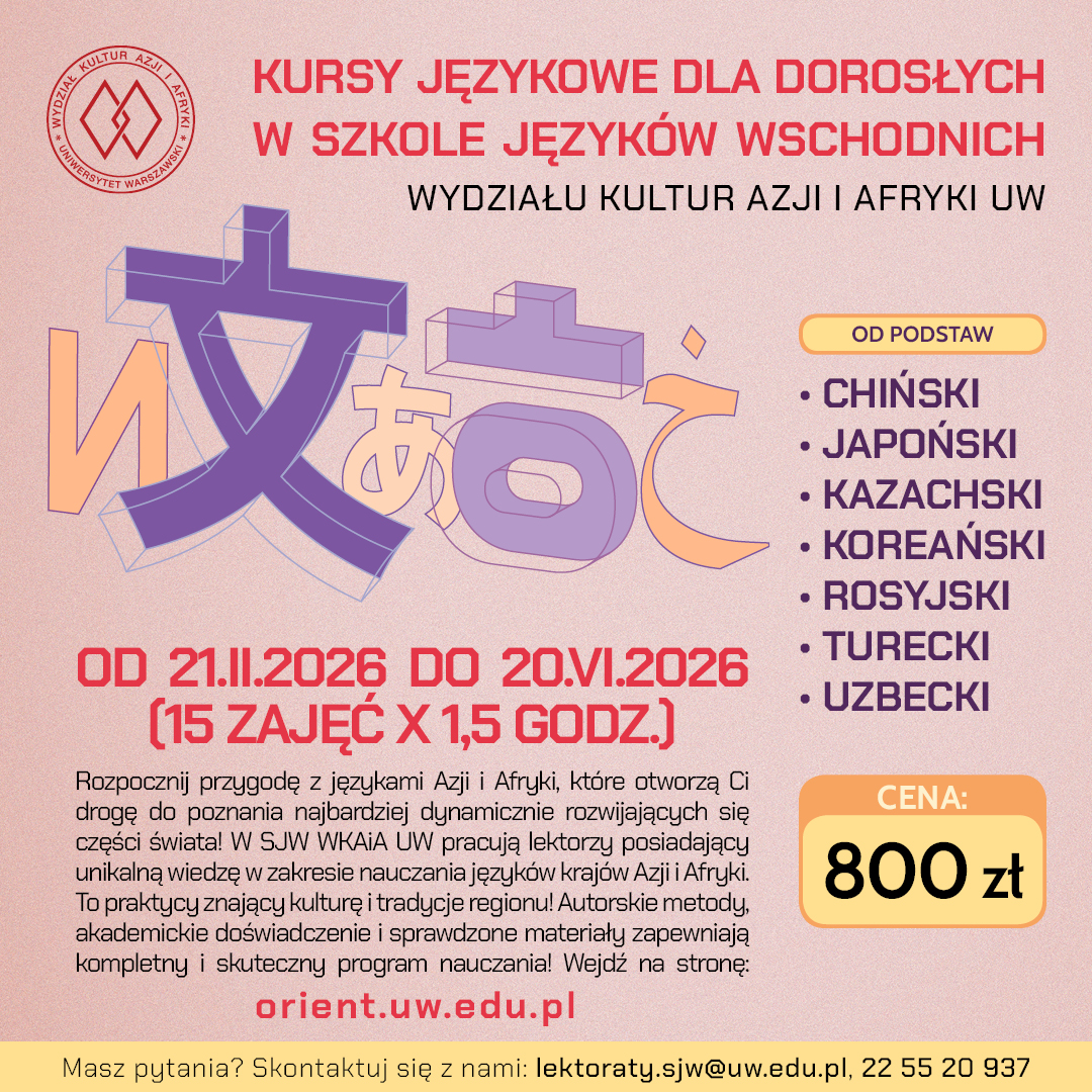 W imieniu organizatorów serdecznie zapraszam na wernisaż wystawy prezentującej dorobek Wydziału Kultur Azji i Afryki w hallu Pałacu Kazimierzowskiego w dniu 19 stycznia 2026 o g. 12.00.