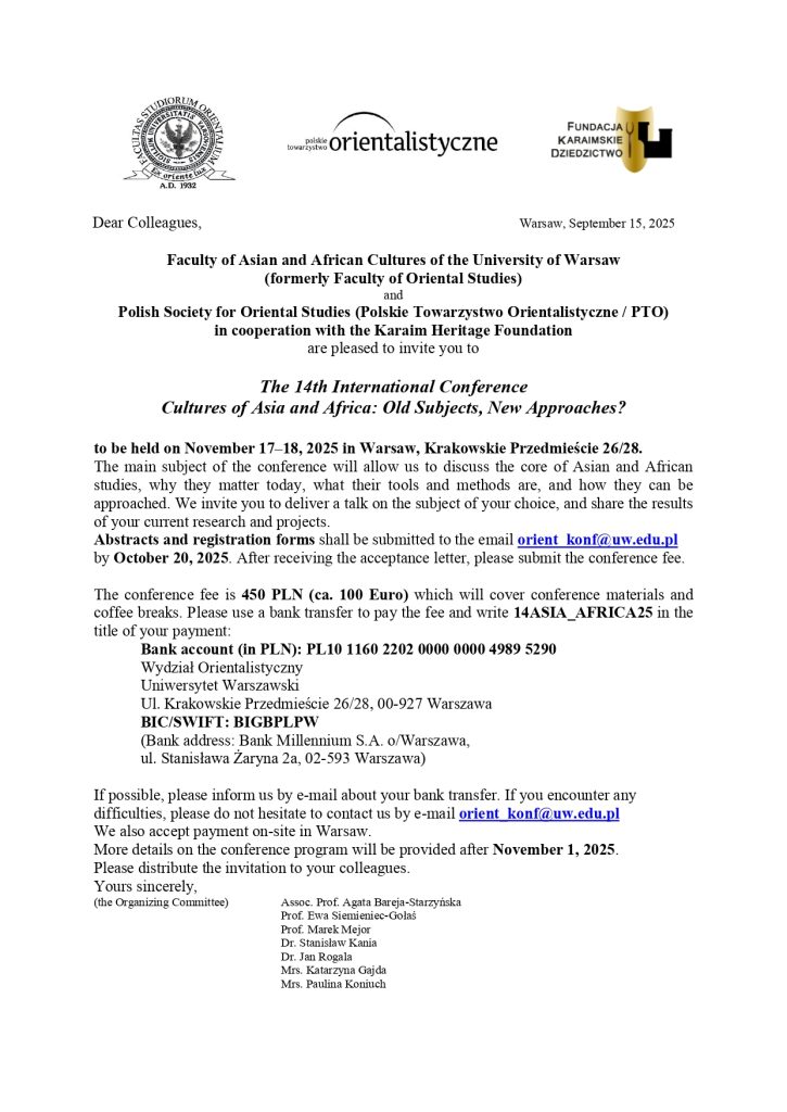 Zaproszenie do udziału w międzynarodowej konferencji „The 14th International Conference Cultures of Asia and Africa: Old Subjects, New Approaches?” (Warszawa, 17-18.11.2025)