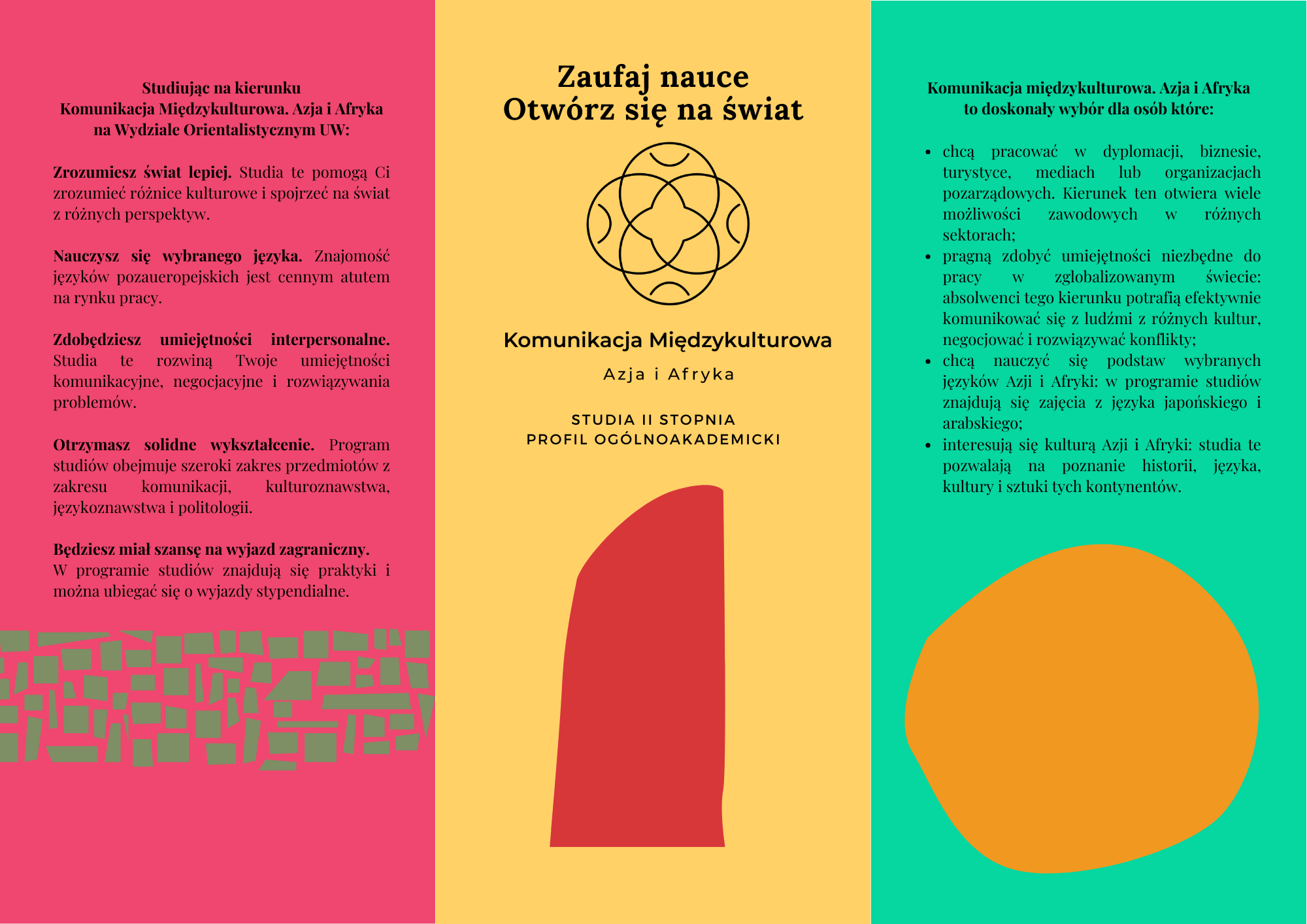 The educational concept for the “Cross-cultural Communication – Asia and Africa” program involves providing students with knowledge about theories concerning cultures and communication, as well as knowledge about selected aspects of specific cultures. The essence of this study program is to broadly present issues of intercultural dialogue, the interdependencies between cultures, and the processes occurring between them. The studies prepare students to combine knowledge and practice in raising awareness and teaching others how to solve problems arising from cultural differences.